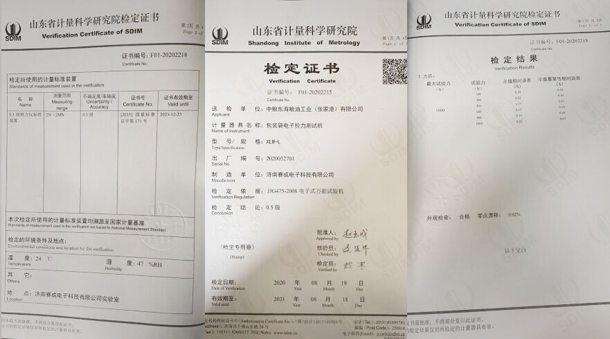 為了更好的交付這批設(shè)備,確保設(shè)備測試數(shù)據(jù)的準(zhǔn)確性,濟(jì)南賽成儀器向山東省計(jì)量科學(xué)研究院提出了檢定申請。依據(jù)JJG475-2008電子式萬能試驗(yàn)機(jī)的檢定規(guī)程,省計(jì)量院工作人員對XLW-L包裝袋電子拉力試驗(yàn)機(jī)的精度和誤差等進(jìn)行了檢定,經(jīng)檢定結(jié)論達(dá)到0.5級,檢定結(jié)果合格。2020年8月9日獲得山東省計(jì)量科學(xué)研究院頒發(fā)的檢定證書,獲得的這份檢定證書,進(jìn)一步證明了濟(jì)南賽成儀器符合預(yù)定要求和質(zhì)量要求,測量結(jié)果準(zhǔn)確,儀器持續(xù)可靠,性能穩(wěn)定。